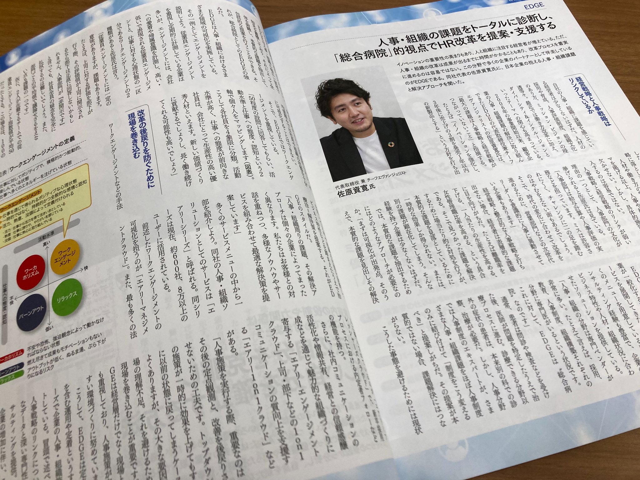 EDGEの人事・組織課題に対する向き合い方や考え方を弊社代表の佐原がお答えしました。 ワークエンゲージメント実現に向けたアプローチ手法について2ページにわたり掲載されております。