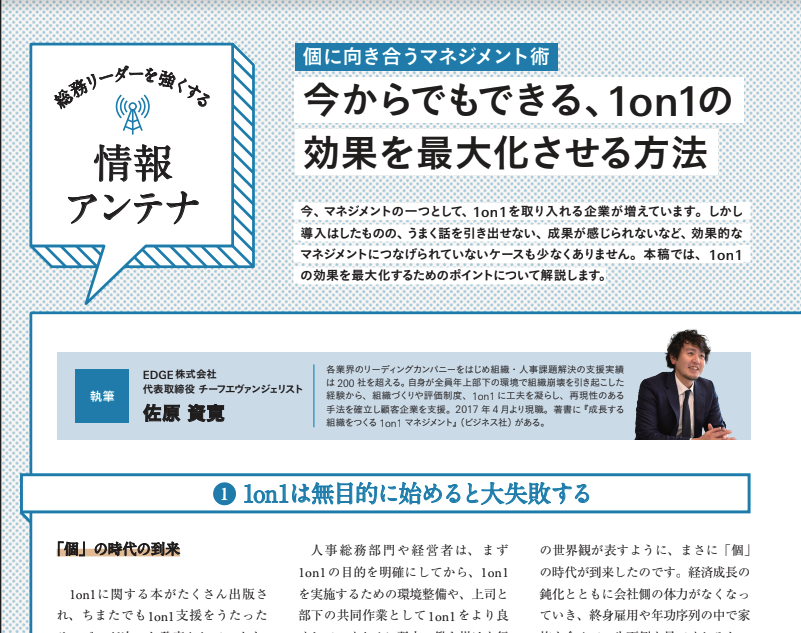月刊総務2023年5月号「情報アンテナ」のコーナーにて弊社代表の佐原が「個に向き合うマネジメント術 今からでもできる、1on1の効果を最大化させる方法」 を寄稿いたしました。1on1を実施しているが、うまく話を引き出せない、成果が感じられないなど、効果的なマネジメントにつなげられていないケースも少なくありません。本稿では、4ページにわたり、1on1の効果を最大化するためのポイントについて解説しました。